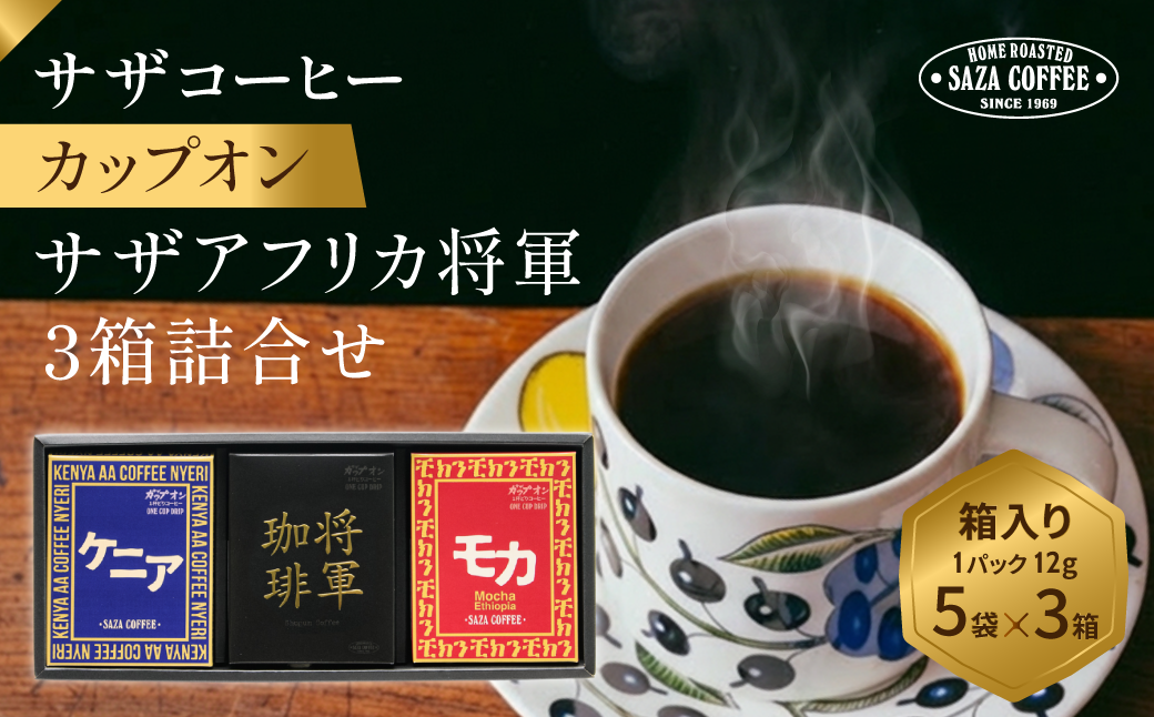 アフリカのコーヒー「ケニア」「将軍珈琲」「サザモカ」の詰め合わせ。贈り物に人気の3種類のカップオンギフトです。