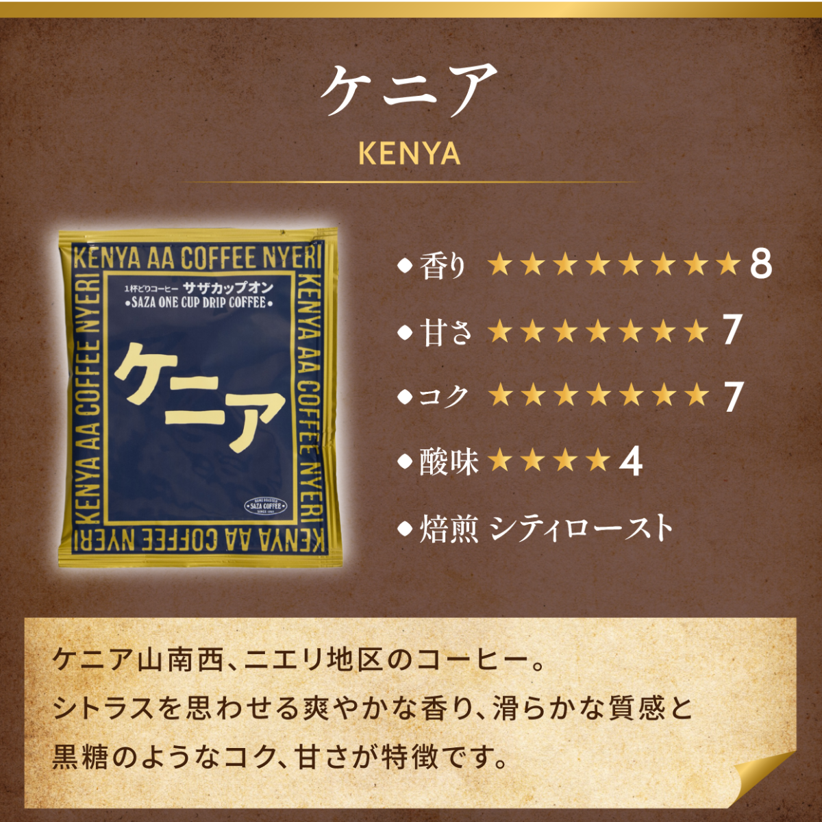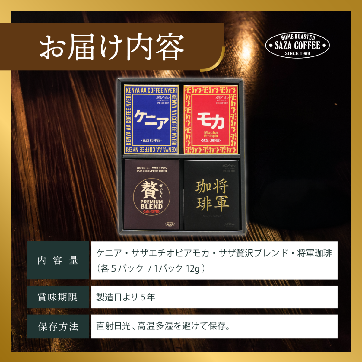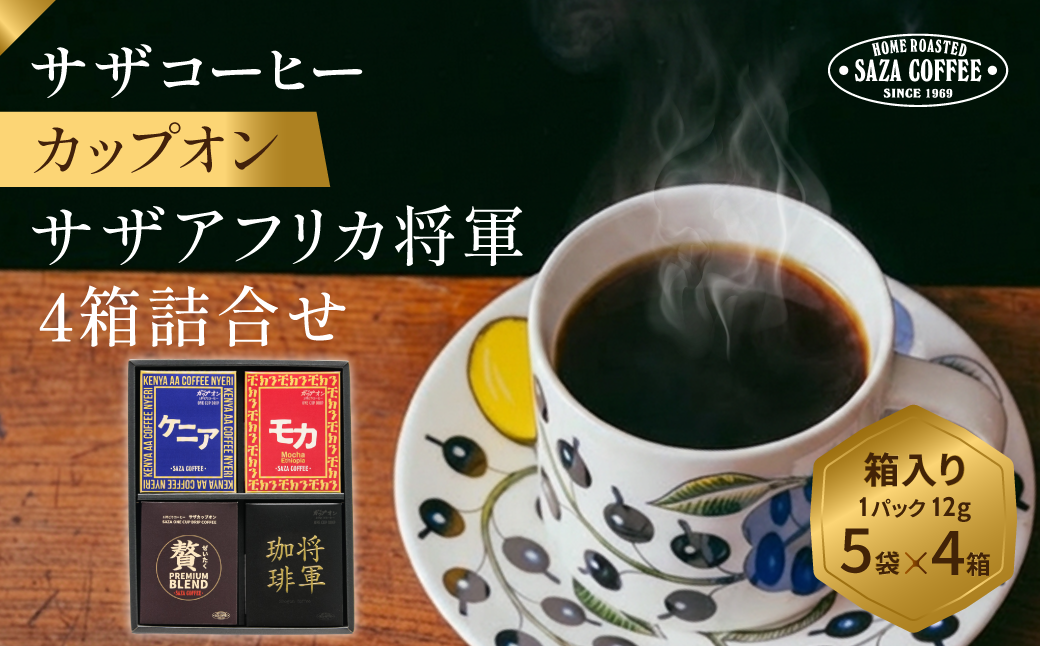 アフリカのコーヒー「ケニア」「サザモカ」、「サザ贅沢ブレンド」、「将軍珈琲」4種のカップオンギフトセット。