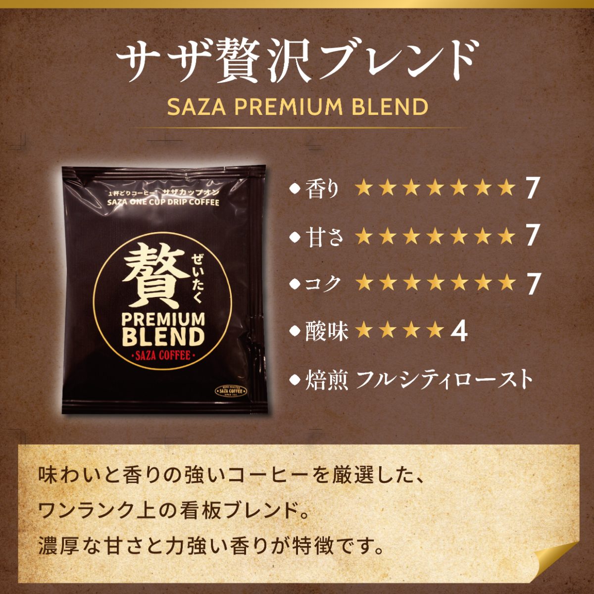 サザ贅沢ブレンドは味わいはもちろんパッケージを開封した瞬間から広がるしあわせな香りが特徴です。