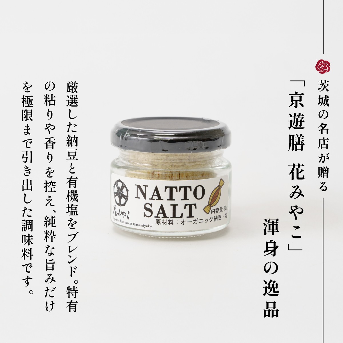 この「NATTO SALT」は、ひたちなか市の名店「京遊膳 花みやこ」が研究開発した逸品です。和食の繊細な風味を追求する料理人が無限の可能性を見出したユニークな調味料です。