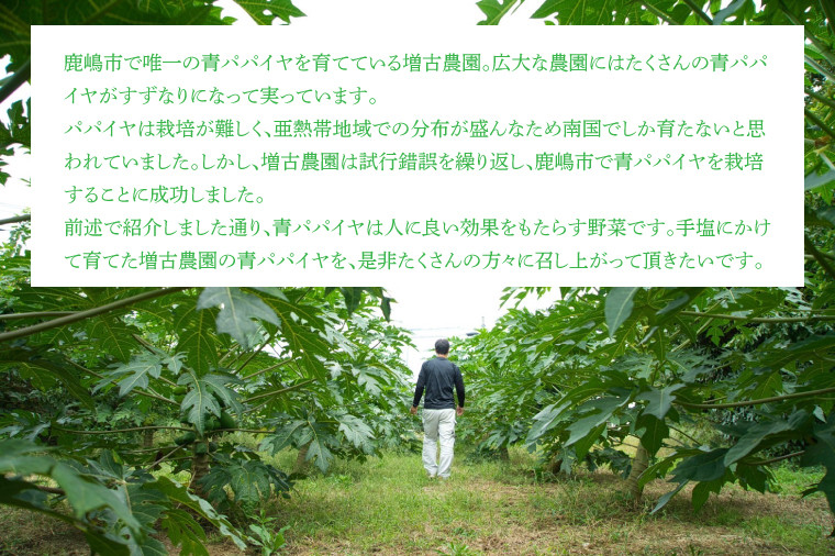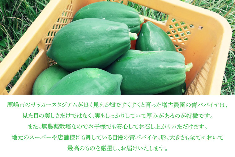 鹿嶋市のサッカースタジアムが良く見える畑ですくすくと育った増古農園の青パパイヤは、見た目の美しさだけではなく、実もしっかりしていて厚みがあるのが特徴です。また、無農薬栽培なのでお子様でも安心してお召し上がりいただけます。地元のスーパーや店舗様にも卸している自慢の青パパイヤ。形、大きさも全てにおいて最高のものを厳選し、お届け致します。