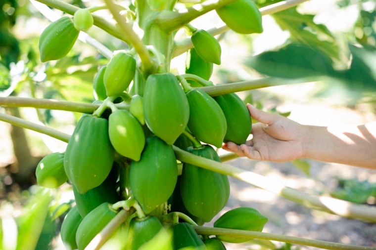 鹿嶋市で唯一の青パパイヤを育てている増古農園。広大な農園にはたくさんの青パパイヤがすずなりになって実っています。