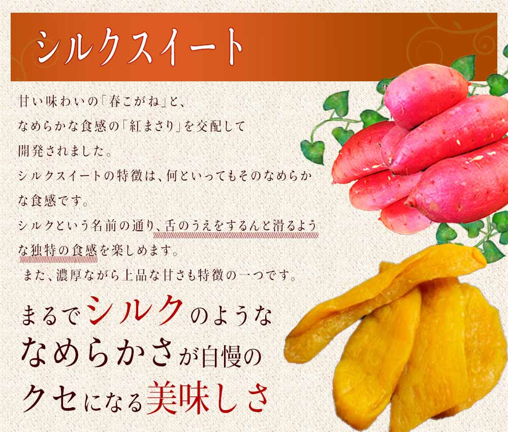| 容量 | 玉豊(平干し)300g×2袋 紅はるか(平干し)300g×2袋 シルクスイート(平干し)120g×3袋 紅はるか(平干し)120g×3袋 紅はるか(丸干し)150g×5袋 |