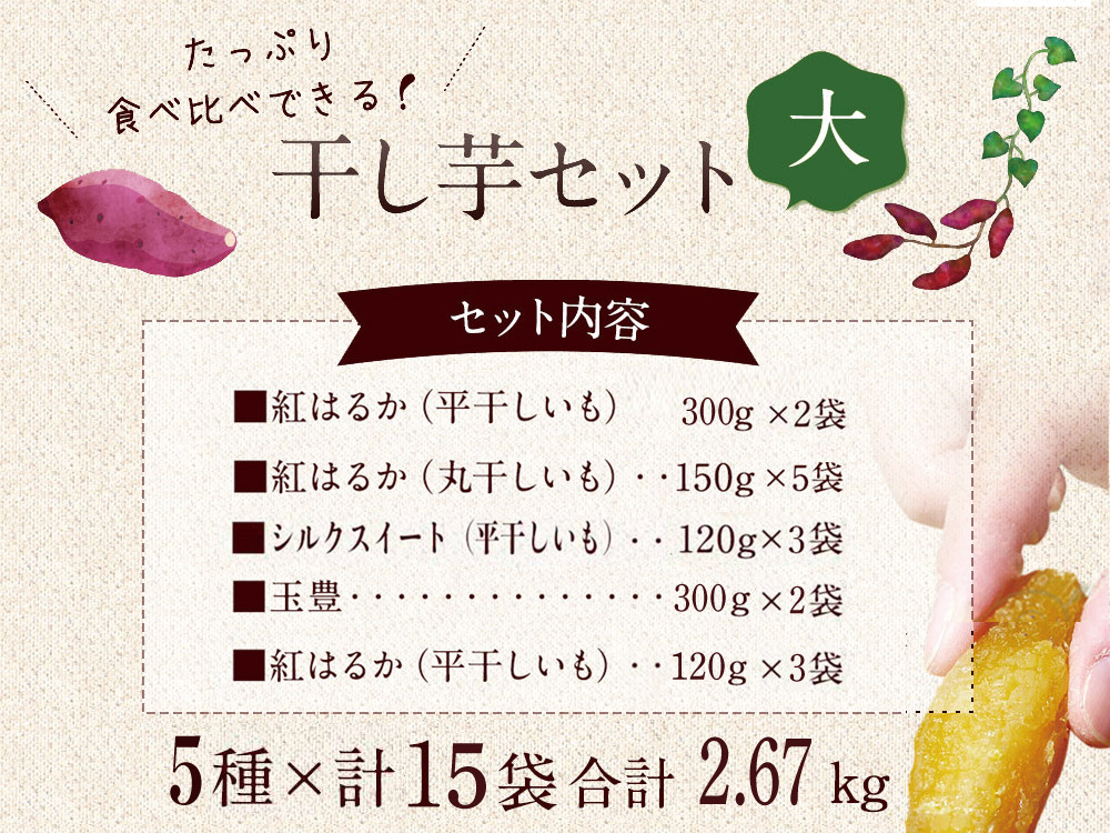 人気 干し芋 35000円以内 おやつ 無添加 たくさん 詰め合わせ ★先行予約★ 人気商品 干芋セット(大) 5種15袋セット 合計2670g 【干し芋 食べ比べ 大容量 紅はるか 玉豊 シルクスイート 平干し 丸干し 国産 鹿嶋市 茨城県】(KE-16)