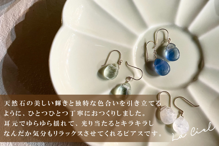 耳元でゆらゆら揺れて、光り当たるとキラキラしなんだか気分もリラックスさせてくれるピアスです。