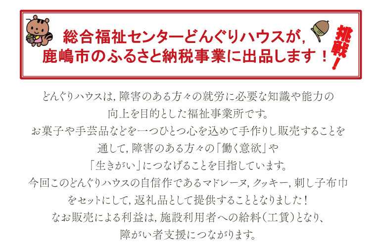福祉支援 手作り お菓子 クッキング 刺し子 【期間限定】どんぐりハウス ミニコロセット 【茨城県 鹿嶋市 お菓子 セット スイーツ 福祉 刺し子 布巾 手芸 手作り 洋菓子 焼き菓子】(KCN-2)