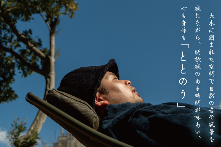 井戸から汲み上げた水風呂で身体を冷やし、大木に囲まれた空間で自然の音や風景を感じながら、開放感のある時間が味わい、心も身体も「ととのう」。