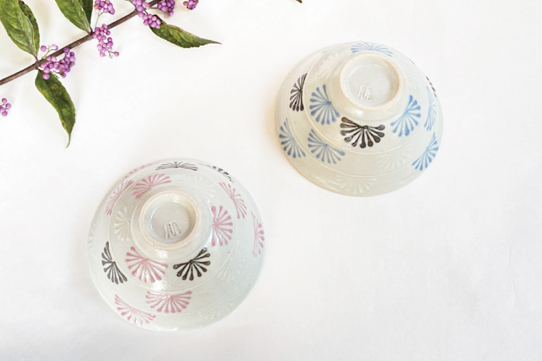 桜色と空色の2色使いのお茶碗になります。ふちにも紋様が施されているので、ごはんをよそった時に明るい感じになります。