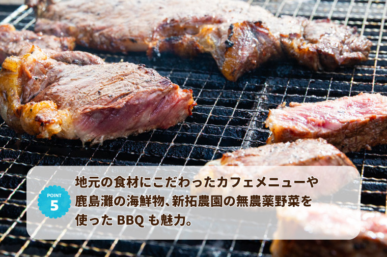 地元食材にこだわったカフェメニューや、鹿島灘の海産物、新拓農園の無農薬野菜を使ったBBQも魅力。
