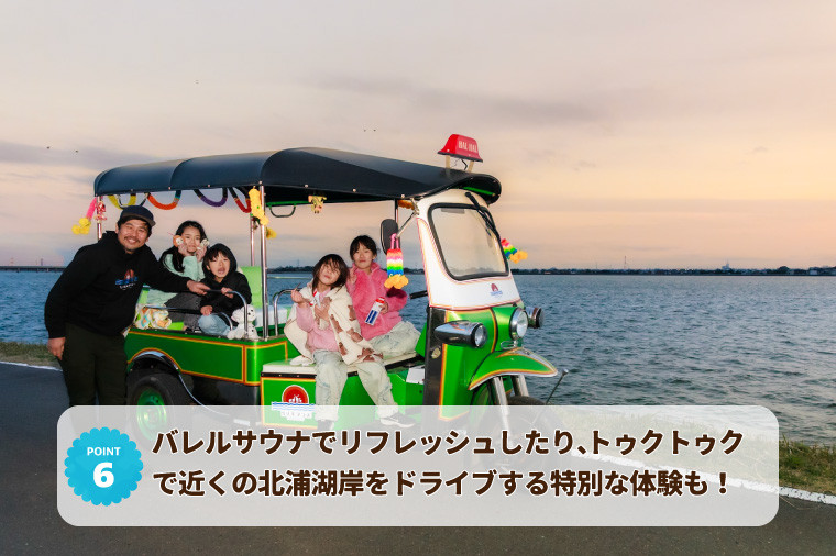 バレルサウナでリフレッシュしたり、トゥクトゥクで近くの北浦湖岸をドライブする特別な体験も!鹿嶋の自然を満喫する、特別な休日をツマギアンズで過ごしませんか?