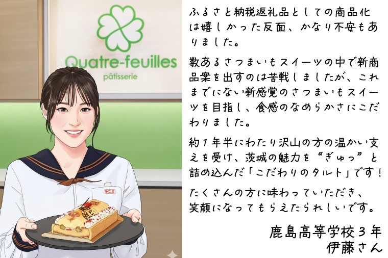 鹿嶋市としてもこれからの未来を担う若者の思いに、「他人事ではない」ことに気づかされ、提案書に書かれた熱い想いを、地元で人気の洋菓子店パティスリー キャトルフィユさんに伝えたところ二つ返事でOKをいただきました!そして、何度も打ち合わせと試作を重ね、ついに完成♪思いを込めて全国の皆さんへお届けします。