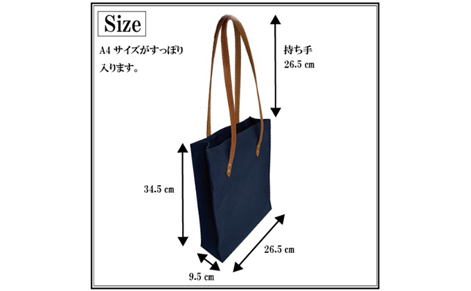 | 容量 | 倉敷産帆布×本牛革 スクエアバッグ(紺×ブラウン) 【寸法】 横27×高さ34.5×幅9 持ち手長さ28 【素材】 本体:6号帆布(綿100%) ハンドル:牛革 【製造地】 茨城県守谷市 |