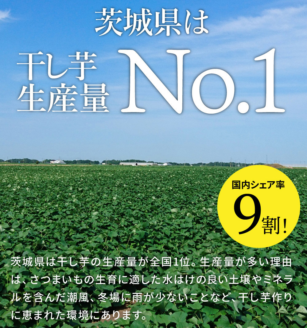 茨城県産「紅はるか」を使用し、大切に真心を込めて干し芋に加工しています。