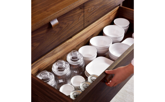 現代のライフスタイルに合う、すっきりとしたデザインと使い勝手が魅力のこのキッチンボードモデルノ。しっかりとした作りの中にも、木の優しさや温もりが感じられ、和室洋室を問わずレイアウトすることができます。ひとつひとつ削り出された取手は、金具を使わずにはめ込まれ、「さすり仕上げ」で接合面の段差を無くしています。また側板で本体を高床式に持ち上げているのが特徴となり、床から本体を浮かせることで通気性を保ち、耐久性とデザイン性を高めています。