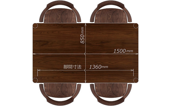 | 容量 | テーブルエミネント 1500 1台 サイズ:幅150cm×奥行85cm×高さ70cm 天板厚:約4cm 脚:丸絞り4本脚(Φ7cm)、ノックダウン式 材質:天然木(ウォールナット無垢材) 塗装:ウレタンクリアー仕上 アームチェアグランデ 4脚 サイズ:幅59.5cm×奥行56cm×高さ73.5cm(座面高さ41cm、アーム高さ66.5cm) 材質:天然木(ウォールナット無垢材) 塗装:ウレタンクリアー仕上 |