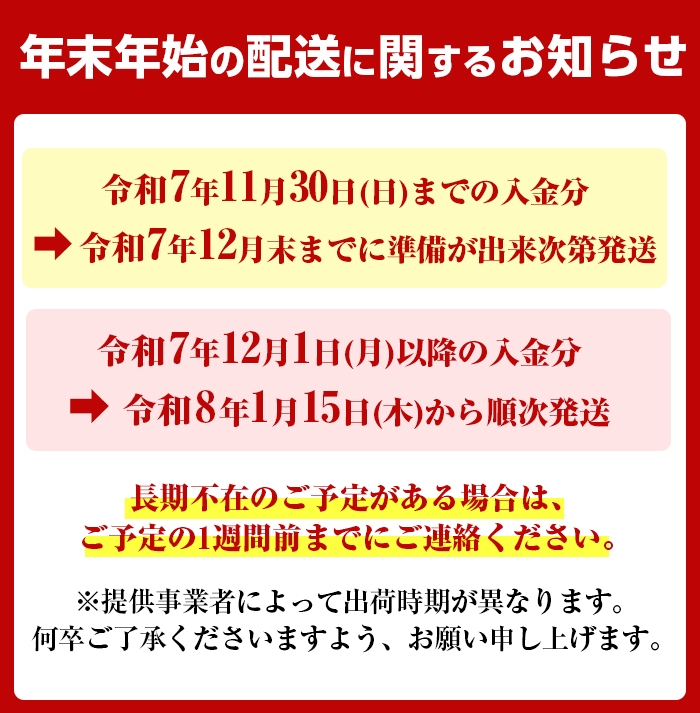 ご入金確認から2ヶ月までに順次発送 (長期不在のご予定がある場合は、ご寄附後1週間以内にご連絡ください) ※配送日の指定は承っておりません。長期不在等により返礼品をお受取りできなかった場合、再発送はいたしかねます。 ※年末年始、繁忙期は通常期よりお時間をいただく場合がございます |