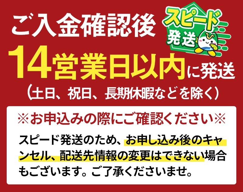 ご入金確認から14営業日以内に順次発送 (長期不在のご予定がある場合は、ご寄附後1週間以内にご連絡ください) ※配送日の指定は承っておりません。長期不在等により返礼品をお受取りできなかった場合、再発送はいたしかねます。 ※年末年始、繁忙期は通常期よりお時間をいただく場合がございます |