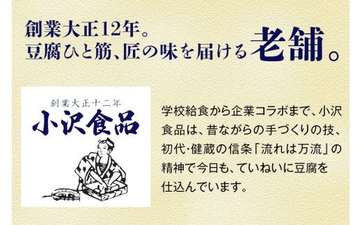 定番の木綿豆腐・絹豆腐はもちろん、社内女性人気No.1の「よせとうふ」、すき焼きや肉豆腐にぴったりな香ばしく焼き上げた「焼豆腐」など、バラエティ豊かなラインナップ。