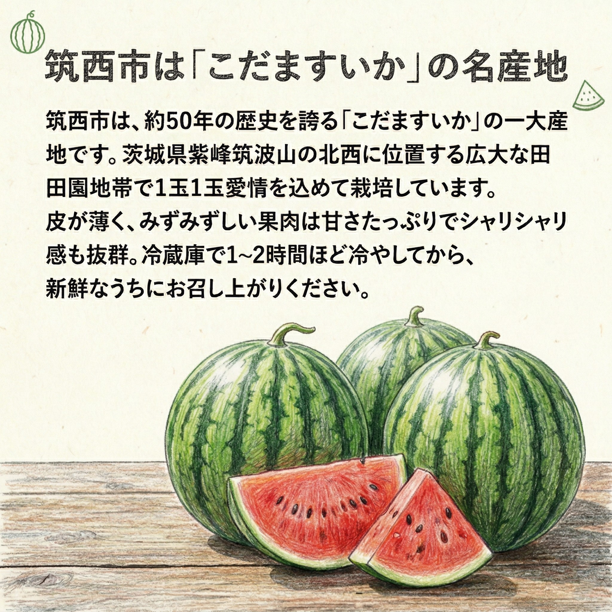 初夏の味わいこだますいか、冷蔵庫で1~2時間ほど冷やしてから、新鮮なうちにお召し上がりください。