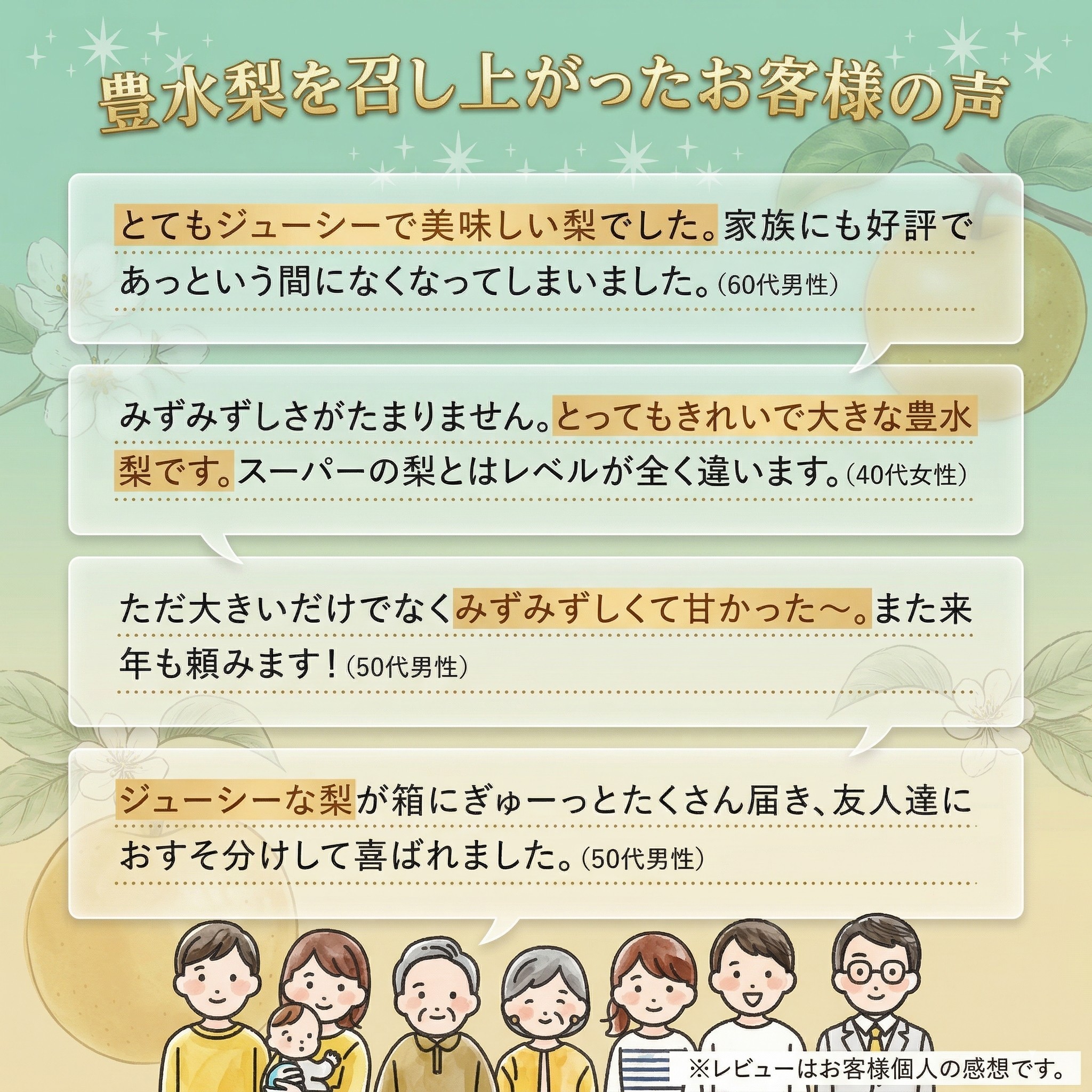 大きく、みずみずしい梨が届きました。甘くてジューシーでとても美味しい梨で、家族にも好評でした。またお願いしたいと思います。