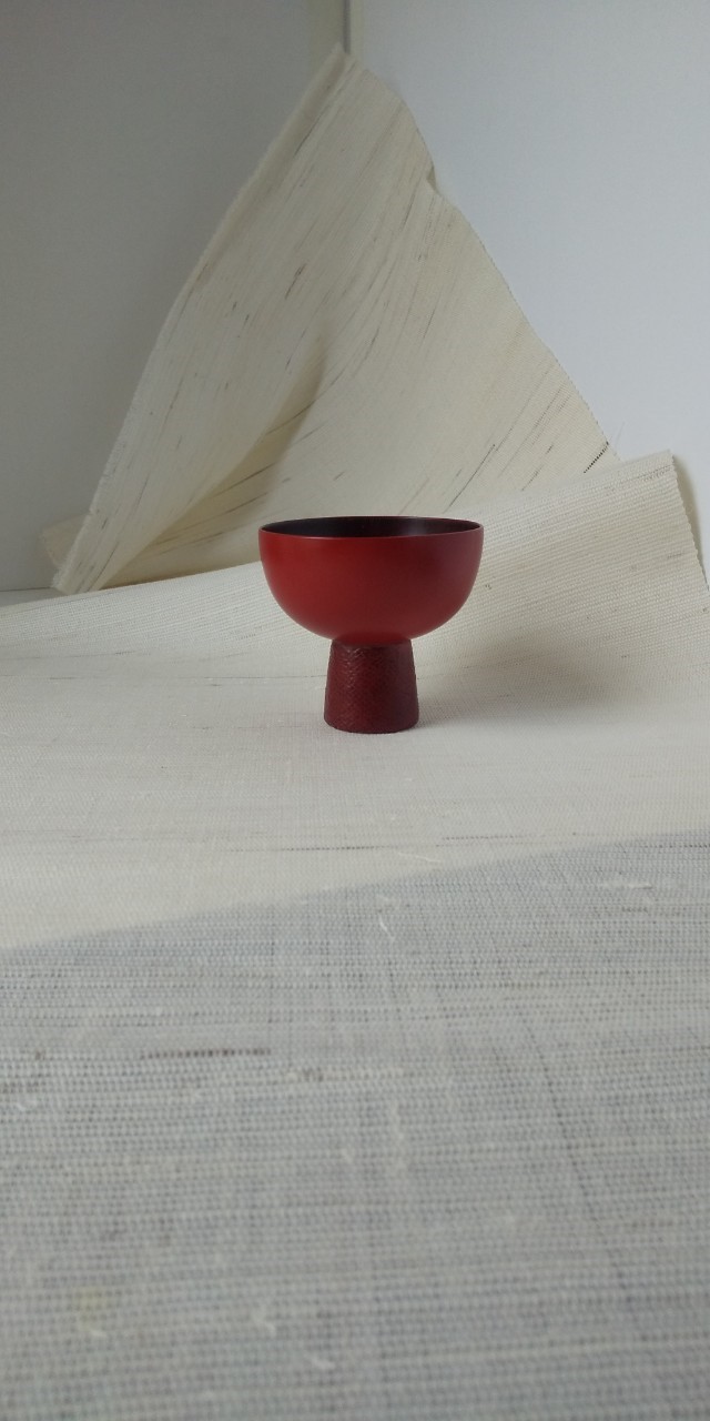 欅材に漆を塗り重ね、内側は木目が見えるように溜塗りをほどこしています。外側は朱漆と麻布を張り模様に、使っていると根来の様な風合いが生まれます。
