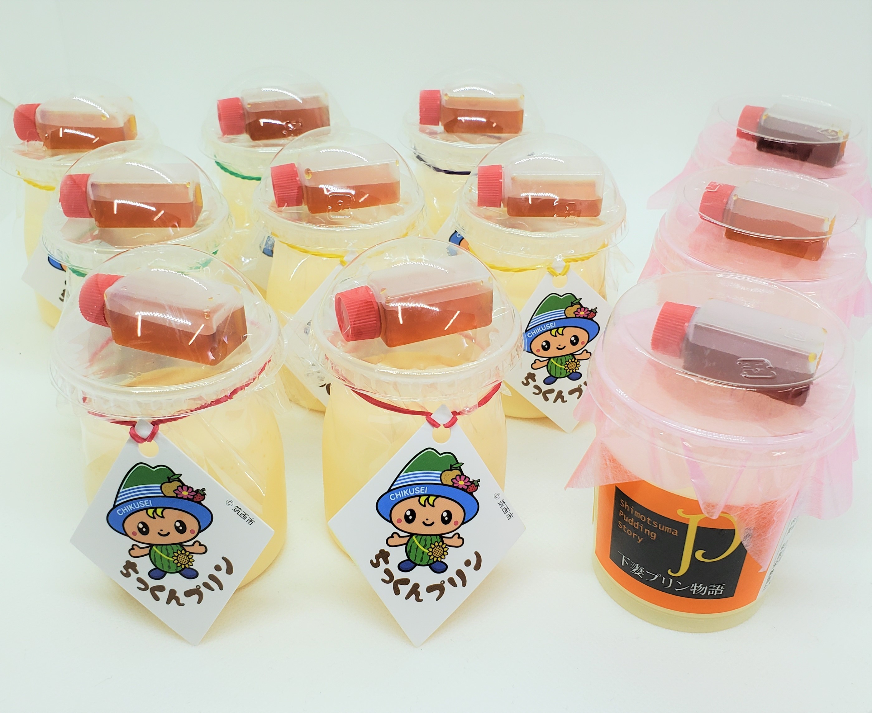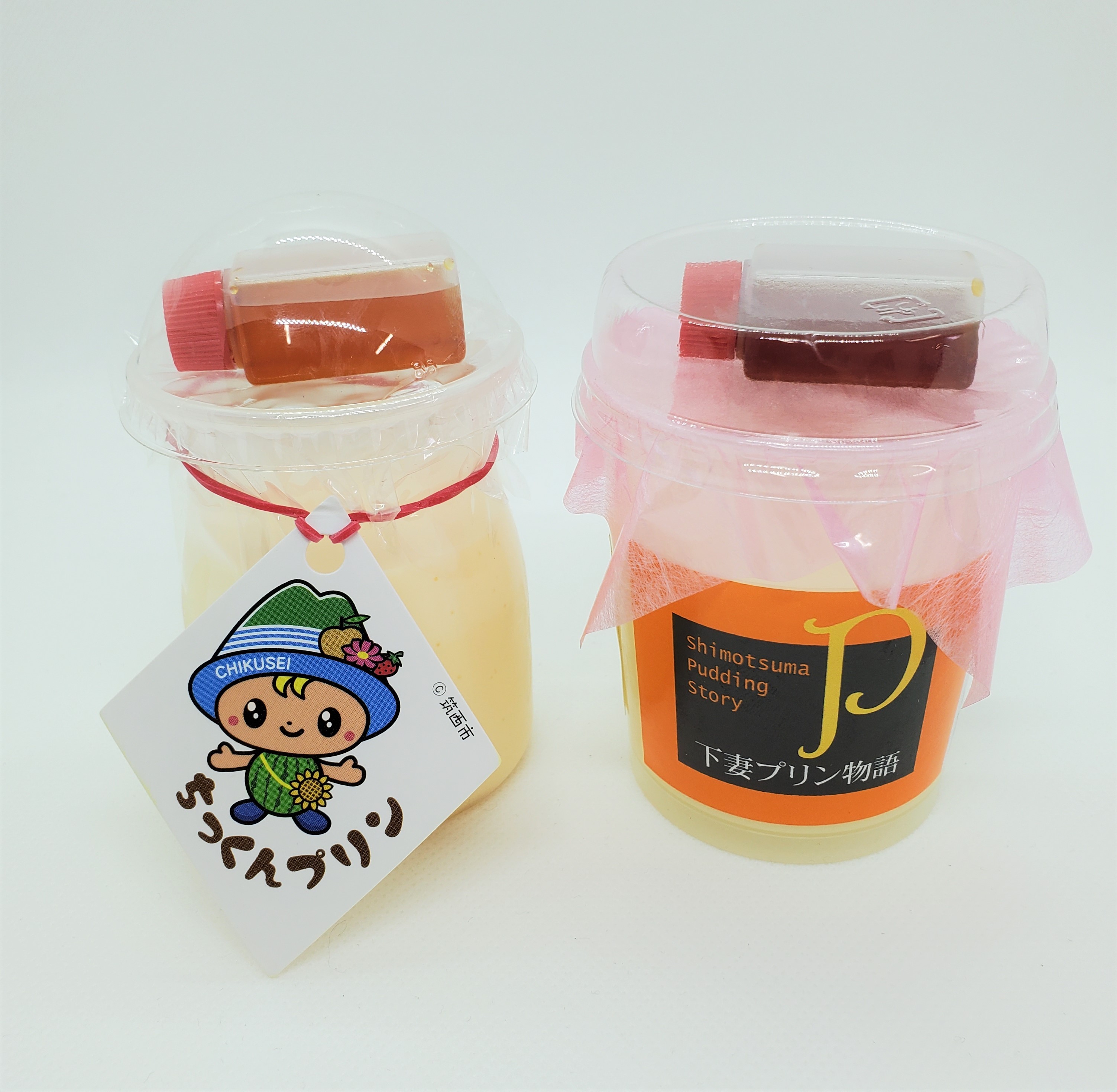 ②下妻プリン:下妻の恵まれた自然の大地で育ったこだわりの平飼い有精卵を使用しています。濃厚な卵の風味とはちみつの自然な甘みが特徴のまた食べたくなるプリンです。