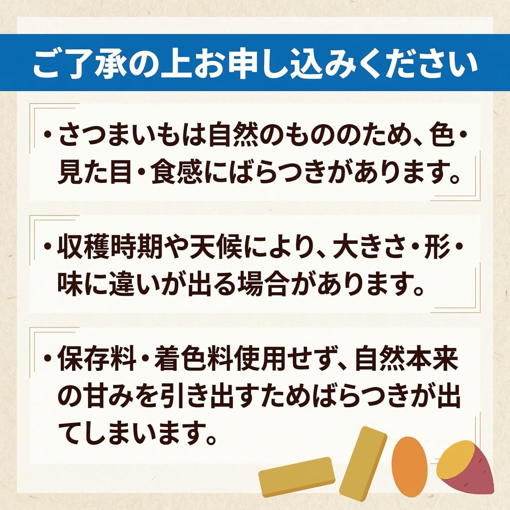 干し芋は半生商品です。商品到着後は冷蔵庫、又は小分けにし冷凍庫で保存して下さい。