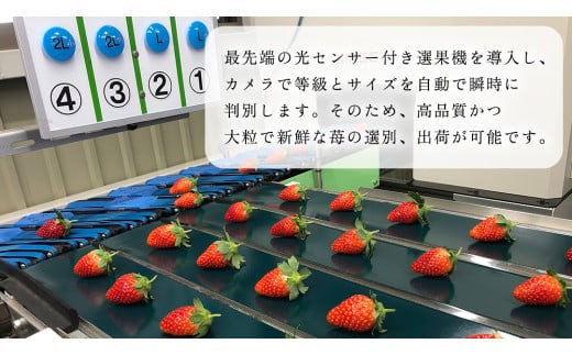 いちごの選別は国内でも最先端の選果機を導入し、カメラで瞬時に判別し、当日収穫したものをその日のうちに出荷するので、品質と鮮度が自慢の逸品です!