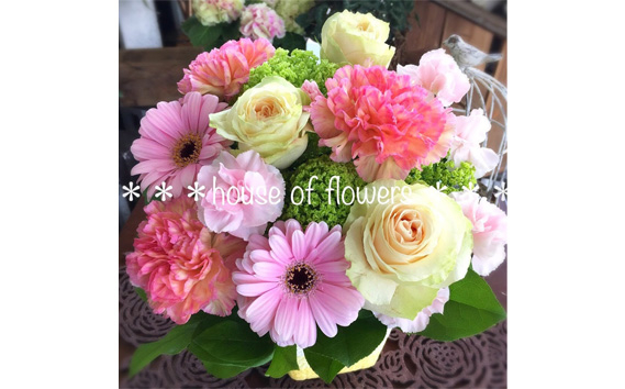 新鮮な季節のお花を使ったピンク系フラワーアレンジメントになります。