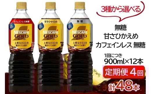 挽きたての香りで、上質なひとときをお楽しみください 【定期便/4ヶ月】ネスカフェ ゴールドブレンド ボトルコーヒー 計48本 [(1回につき900ml×12本)×4回](3種から選べる:甘さひかえめ/無糖/カフェインレス 無糖)|珈琲 アイスコーヒー カフェ ケース ギフト ネスレ [1788-1791]