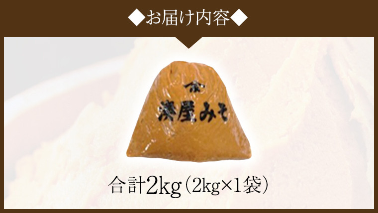 材料の大豆にこだわり、良質な地下水を使用した、まろやかで糀の甘味が引き立つ味噌です。糀をふんだんに使用し、100余年にわたり受け継がれた秘伝の醸造法で手間暇かけて仕込んでおります。 他の味噌の追随を許さない、味の豊かさをお楽しみください。 使いやすい1㎏袋を2個セットでお届けいたします。 【注意事項】 ※配送できない地域がございます※ ・伊豆諸島:青ヶ島村(青ヶ島)・利島村(利島)・御蔵島村(御蔵島)・式根島 ・小笠原諸島:小笠原村(父島・母島・硫黄島・南鳥島など)