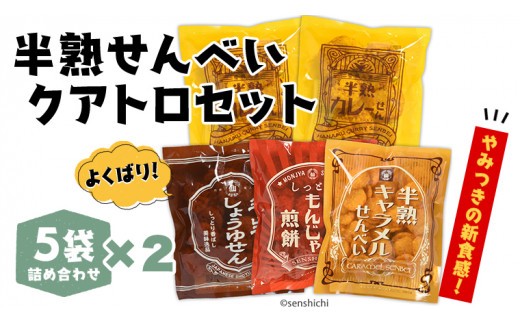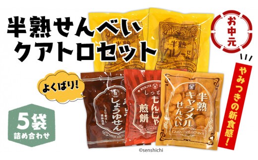 サービスエリア大人気商品「半熟せんべい」4種5袋を詰め合わせたお得なセット! 半熟せんべい 5袋詰合せ クアトロセット 半熟カレーせん 半生しょうゆせん 半熟もんじゃ煎餅 半熟キャラメルせんべい カレー味 かつおだし 甘辛ソース 新食感 もんじゃ ぬれせんべい せんべい 煎餅 煎餅屋仙七 [AO008sa]