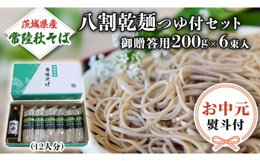 絶品!常陸秋そば乾麺 【お中元熨斗付き】茨城県産 常陸そば 乾麺 贈答用 つゆ付セット 乾麺200g×6袋 麺つゆ300ml×1本 そば 熨斗 熨斗付き お中元 御中元 送料無料 [BE032sa]