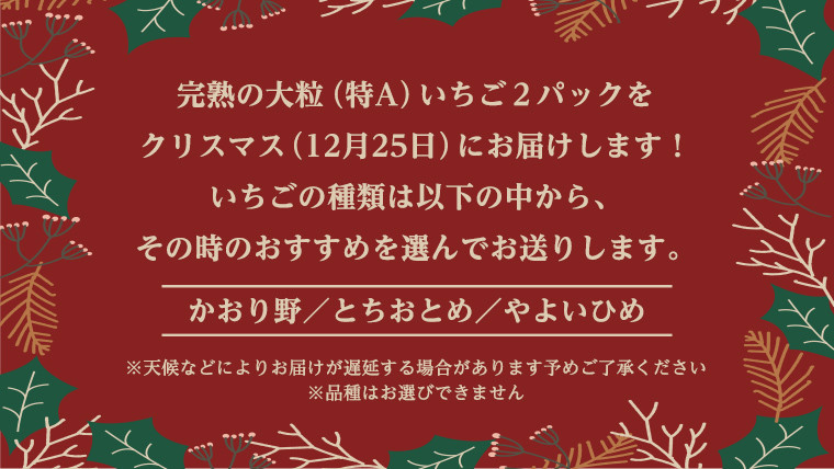 クリスマス(12月25日)に、特Aランクの完熟大粒いちご2パックをお届けいたします!いちごの品種は、以下の中からその時期のおすすめを厳選してお送りします。