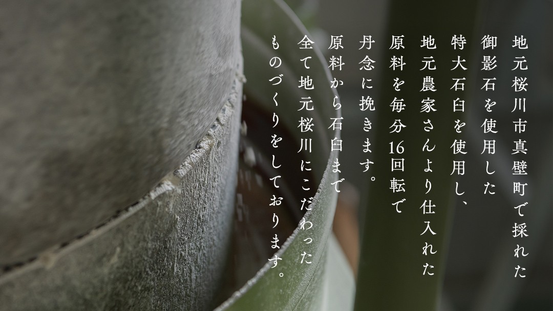 地元桜川市真壁町で採れた御影石を使用した特大石臼を使用し、地元農家さんより仕入れた原料を毎分16回転で丹念に挽いた蕎麦粉は多くのお客様にご好評いただいております。原料から石臼まで全て地元桜川にこだわったものづくりをしております。