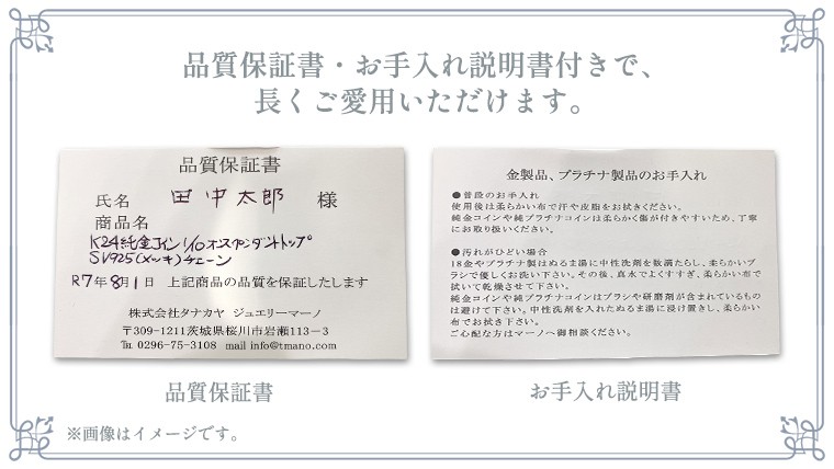 | 容量 | Pt1000 純プラチナ フォースコイン1/25oz(1.24g) Pt850製ペンダント枠 大きさ約22mm×14.5mm(バチカン含む) 枠のバチカンの一部に店名(太陽マーク)が刻印されています。 チェーン シルバー925製45cmネックレス長さ調節付 |