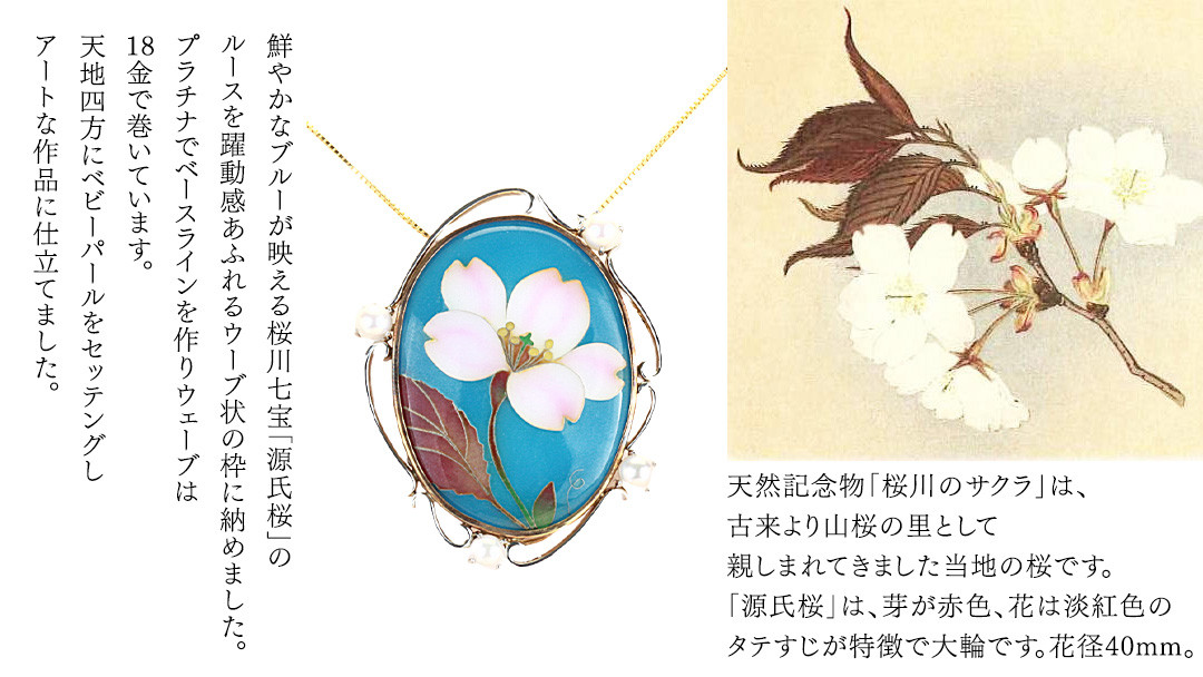 天然記念物「桜川のサクラ」11種を、日本の伝統工芸技術である七宝ジュエリーで表現した、ジュエリーマーノ(タナカヤ)の最新オリジナル商品です。