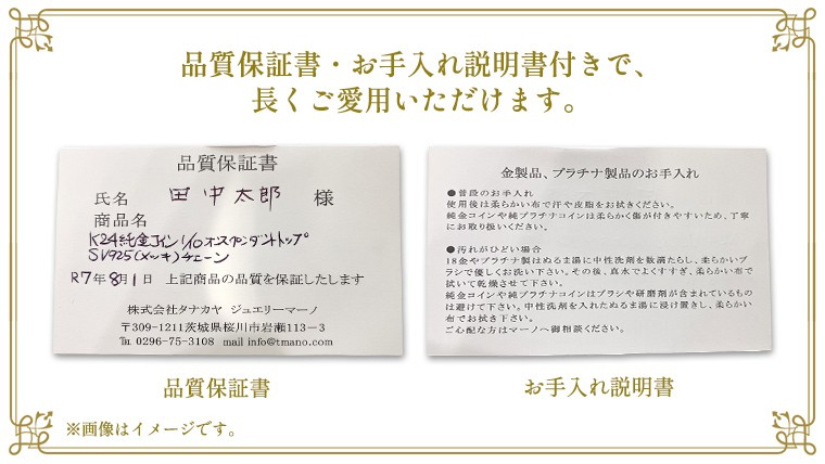 | 容量 | K24純金 メイプル1/4oz(7.75g) K18ペンダント枠 大きさ約30mm×20mm(バチカン含む) 枠のバチカンの一部に店名(太陽マーク)が刻印されています。 チェーン シルバー925製45cmネックレス(18金メッキ)長さ調節付 |
