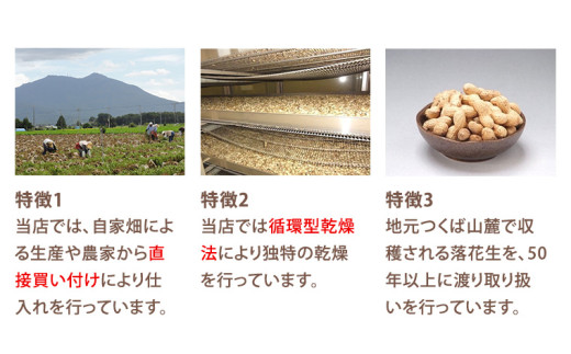自然豊かな桜川市の自家農場や契約栽培農家で生産された落花生を、当店工場で一貫生産しています。風味豊かな落花生をぜひご賞味ください。 【注意事項】 湿気厳禁 開封後は賞味期限にかかわらず、お早めにお召し上がりください。 ※お受け取り後は、すぐに状態をご確認ください。※ 万全を期して返礼品をお届けしていますが、万が一、不備等があった場合は返礼品受け取り時に、写真(画像)を添付のうえ電子メールにてご連絡ください。 日数が経ったものに関しましては対応いたしかねますので、ご了承ください。 また、不備等があった返礼品は食べたり、飲んだり、捨てたりせず、対応が決まるまで保管をお願いします。保管されてない場合、代替品での対応等が難しい場合がございます。 ご連絡先:sakuragawa@furusato-g.com