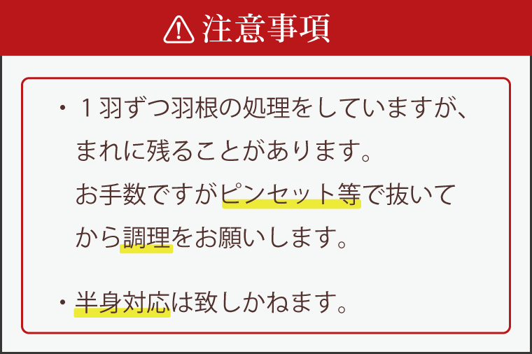 ※1羽ずつ羽根の処理をしていますが、まれに残ることがあります。