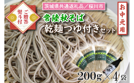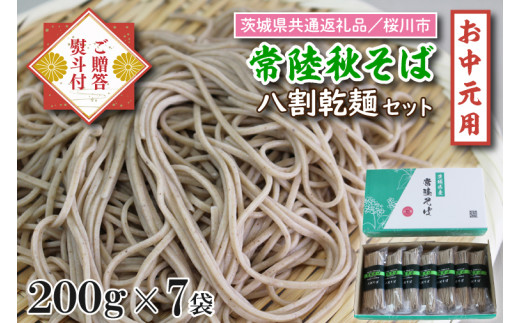 ★お中元★ 贈答用・熨斗付 【茨城県共通返礼品/桜川市】 茨城県の県西部、三方を山に囲まれた山里の町、桜川市のそば粉で作った乾麺です。 そば農家で栽培から収穫、加工、販売し足かけ40年、品質は折り紙付きです。 弊社生産の常陸秋そばのそば粉を8割配合して仕上げた乾麺です。 乾麺とは思えない風味・甘味が感じられる逸品です。 ご贈答やちょっとした手土産としても悦ばれます。 熨斗も対応いたします。 【ゆで時間 約5分~6分】2ℓ以上の沸騰したお湯の中にパラパラとほぐしながら入れ、お湯をふきこぼさないように火力を調整してください。 差し水は、お湯の温度を下げますのでしないでください。 ゆで上がったら手早くザルに上げ流水でよくさらし、冷水で冷やします。 よく水気を切ってお召し上がりください。 まじめでコツコツ、美味しいおそばをお届けできるよう日々工夫しながらそば作りをしています。 そば作りにこだわった農家がお届けする乾麺をお楽しみください。 当社はそば作り足かけ40年、常陸秋そば一筋の農家です。 常陸秋そばの味わいを一人でも多くの皆様に知って頂きたく乾麺を作りました。 ふるさと納税を始めて間もないのですが、予想を上回るご好評を頂き驚いております。 ふるさと納税を通じて多くの皆様に常陸秋そばの味をお届けできましたら嬉しいです。 そばの「のどごし」にこだわり食感の良い乾麺そばに仕上げました。 茨城産にこだわり,「そばつゆ」も常陸太田市産です。 【そば料理】 春:山菜そば(タラの芽・ふきのとう・コシアブラ・ウド) 夏:ぶっかけ冷やしそば(おくら・とろろ・大根おろし・なすの素揚げ) 秋:野菜の天ぷらそば(サツマイモ・カボチャ・レンコン・舞茸) 冬:けんちんそば、年越しそば 【原産地】 茨城県 【原材料】 そば粉(八割)、小麦粉、小麦たんぱく、食塩 【保存方法】 常温 【注意事項】 ※開封後は出来るだけお早目にご使用ください。 ※直射日光、高温多湿を避け常温で保存をして下さい。