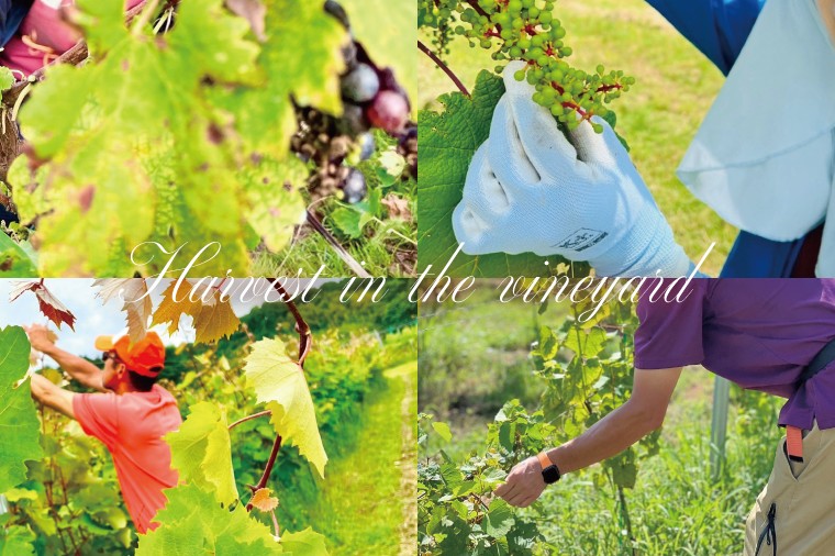 行方市内の4年目の自社畑で、2024年の8月下旬から10月上旬までの猛暑を含む期間、ムクドリによるヴェレゾン前の大量食害で残ったブドウを手摘みで収穫し、丁寧に選果して、牛久の醸造所(麦と葡萄 牛久醸造場)で委託醸造しました。3品種混醸の白と、3品種混醸のロゼの2種類を、それぞれハーフボトルで瓶内2次発酵させたスパークリングワインです。