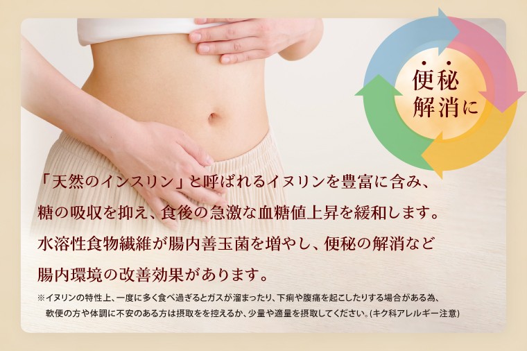 注意点はイヌリンの特性上、一度に多く食べ過ぎるとガスが溜まったり、下痢や腹痛を起こしたりする場合があるため、軟便の方や体調に不安のある方は摂取をを控えるか、少量や適量を摂取してください。