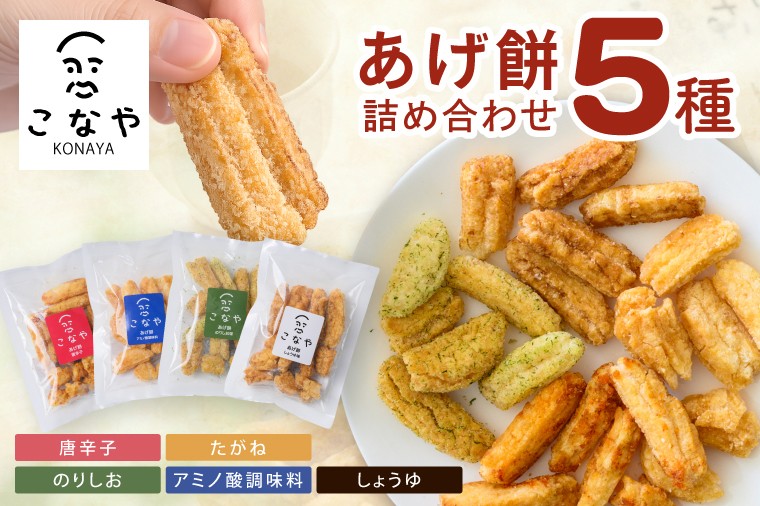 「しょうゆ」、「のりしお」、「唐辛子」、「アミノ酸調味料」、「たがね」の5種類 こなやmini あげ餅詰め合わせ|茨城県 行方市 ふるさと納税 あげ餅 おかき 菓子 和菓子(HX-2)