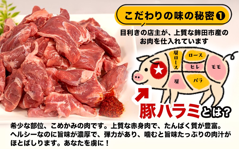 鉾田市民で知らない人はいない。名物豚ハラミ焼(コメカミ)が登場!一般にハラミというと横隔膜を言いますが、鉾田のハラミというと豚のコメカミを言います。コメカミは豚一頭から少量しかとれない超希少部位です。自家製の辛みそと醤油で食べれば、お酒やご飯にぴったり!赤身肉でヘルシーですので、女性にもおすすめ!市民が愛して止まない地元の味を堪能してください。