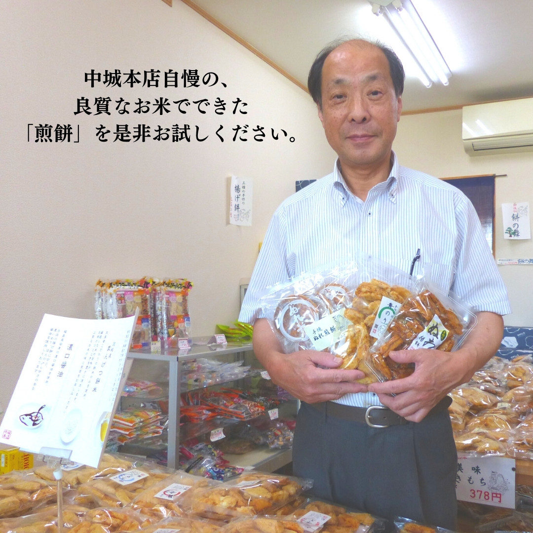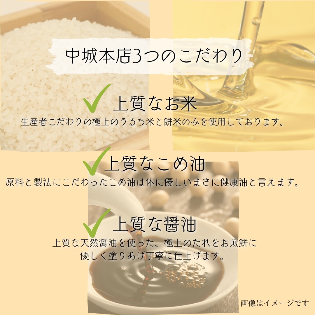 中城本店は茨城県の鉾田市にて長年にわたり煎餅屋を営んでおります。お煎餅の原料の米は茨城県産。生産者こだわりの極上のうるち米と餅米のみを使用しています。揚げ餅には体に優しいとされる、上質なこめ油を使用することでカラっと香ばしい食感が楽しめます。また、日本調味料の代表格である醤油は上質な天然醤油を使い、極上のたれをお煎餅に優しく塗りあげ丁寧に仕上げています。