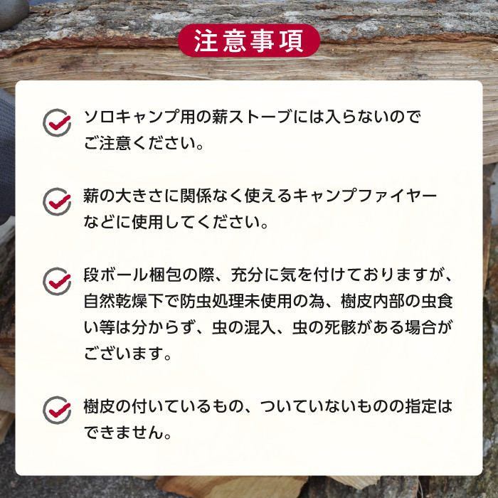 キャンプなどでの使用の際は、太さがあるので長持ちすると思いますが、ソロキャンプ用薪ストーブには入らないのでご注意ください。