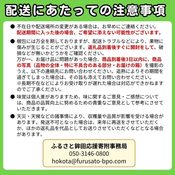 ●返礼品の発送は返礼品提供事業者の準備が整い次第、【各返礼品ページの「発送期日」を目安に順次発送】いたします。順次発送しているため、返礼品の受取日指定はできません。