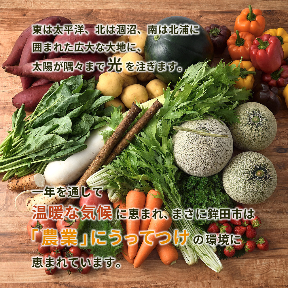 鉾田市は、茨城県鹿行エリアの最北部から中央部にかけて位置し、県都水戸市、筑波研究学園都市、鹿島港まではいずれも30km圏内、首都東京まで90km圏内にあります。面積は207.61平方キロメートルで、県面積(6,096.93平方キロメートル)の3.4%を占めています。東の鹿島灘に沿って位置する鉾田市は、北は涸沼、南は北浦に接し、内陸部のほとんどは平坦地で、その平坦な地形と温和な気候を活かした農業が基幹産業であり、首都圏全体の食料供給地域となっています。主な農産物として、メロン、イチゴなどのほか、みず菜、トマト、甘藷(さつまいも)、ごぼうといった農産物の栽培でも全国有数の生産地として知られています。
