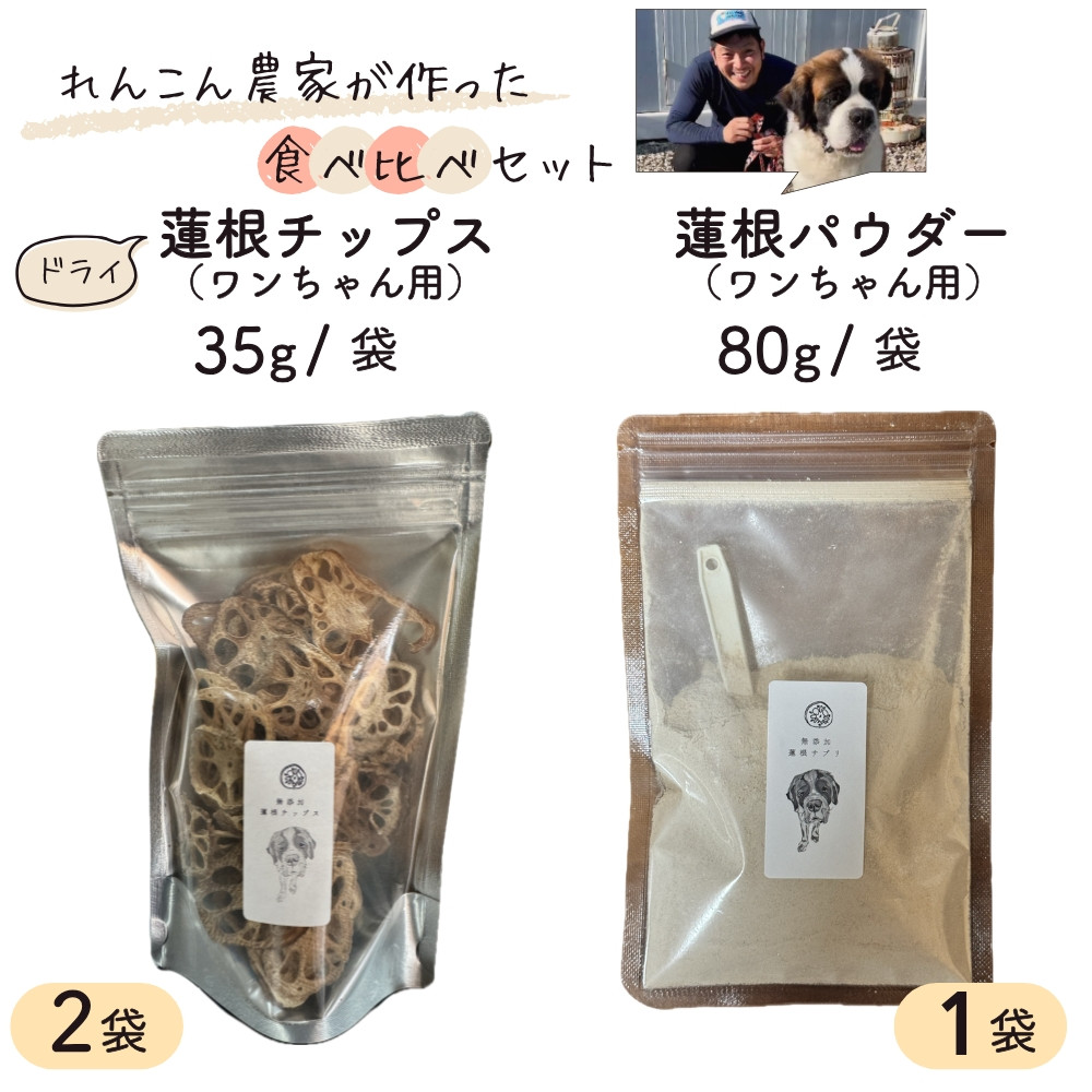 看板犬のいるレンコン農家だからできる 保存料添加物不使用 シンプル製法 根野菜 レンコン 農家が作った ワンちゃん用 ドライ 蓮根チップス & 蓮根パウダー 食べ比べセット 犬用 ドックフード